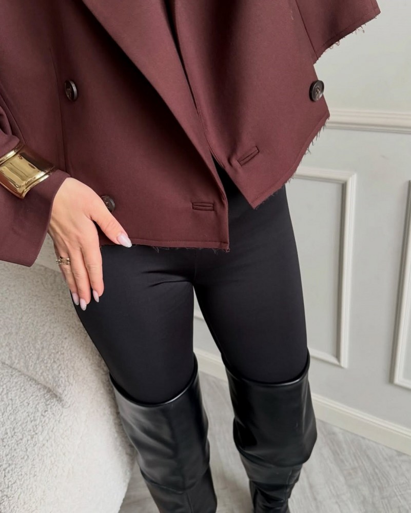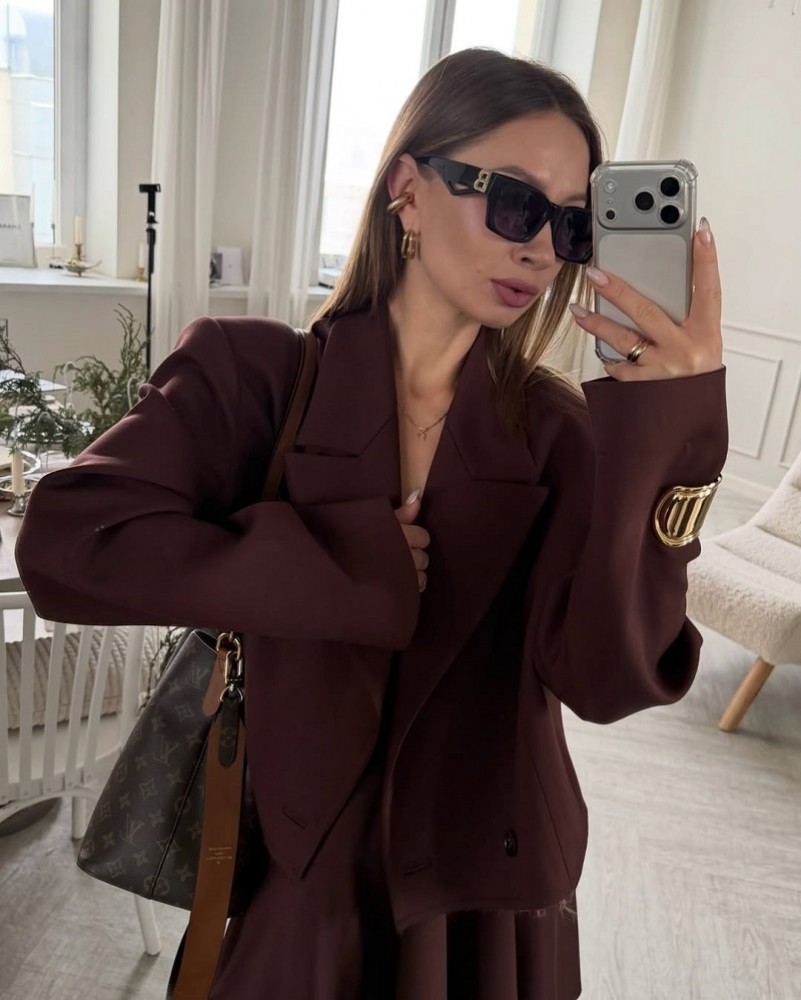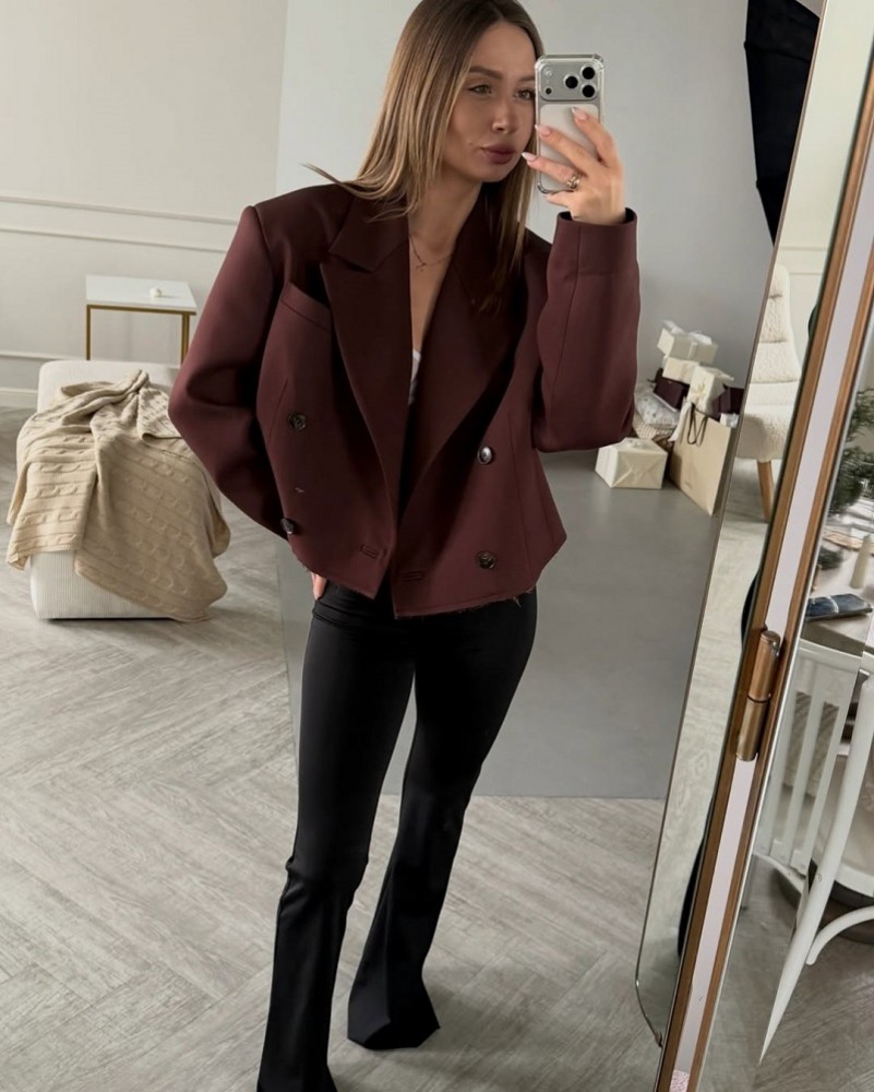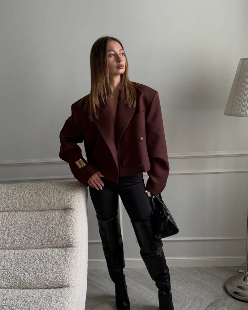 Укороченный жакет насыщенного коричнего цвета - must-have сезона, который мгновенно делает образ сти..
