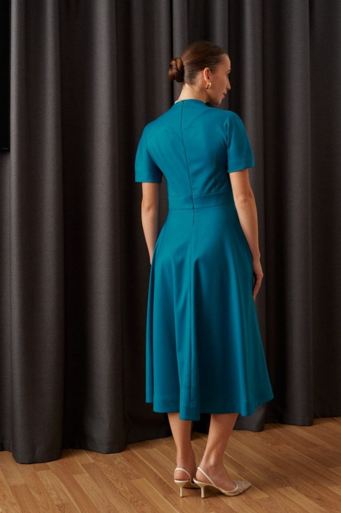 Платье полуприлегающего силуэта из качественной плательной ткани подчеркнет вашу фигуру, аккуратно выделяя талию. Длина миди, пышная юбка на подкладке и элегантный разрез с воротником-стойкой создают утонченный и женственный образ. Удобный короткий рукав, практичные карманы и потайная молния на спинке делают это платье комфортным для повседневной носки. Идеальный выбор для офиса, прогулок или особых мероприятий. Подчеркните свой стиль с этим универсальным платьем.